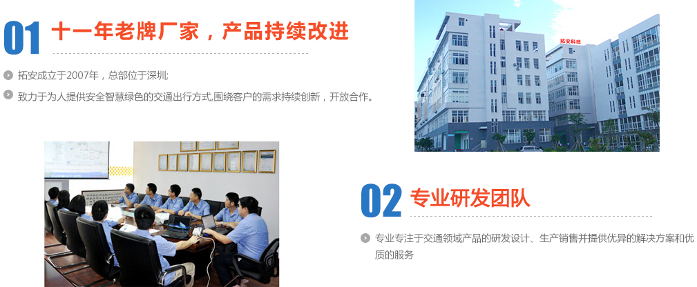 深圳市拓安科技有限公司是一家專業研發、生產、銷售太陽能LED智能交通設備為一體的高新技術企業。主要產品有太陽能道釘、太陽能爆閃燈、太陽能標志牌、太陽能黃閃燈、行車安全誘導霧燈、LED肩燈廠家、LED交通信號燈、太陽能移動紅綠燈、隧道誘導燈、隧道電光標志、車道指示器、LED肩燈、太陽能一體化路燈等?!榭锤唷?/div>